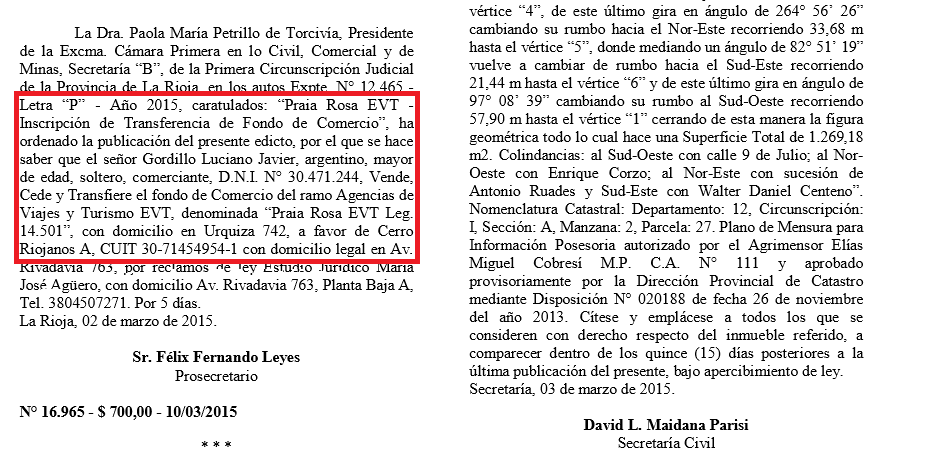 La Dra. Paola María Petrillo de Torcivía, Presidente de la Excma. Cámara Primera en lo Civil, Comercial y de Minas, Secretaría “B”, de la Primera Circunscripción Judicial de la Provincia de La Rioja, en los autos Expte. N° 12.465-Letra “P” -Año 2015, caratulados: “Praia Rosa EVT-Inscripción de Transferencia de Fondo de Comercio”, ha ordenado la publicación del presente edicto, por el que se hace saber que el señor Gordillo Luciano Javier, argentino, mayor de edad, soltero, comerciante, D.N.I. N° 30.471.244, Vende, Cede y Transfiere el fondo de Comercio del ramo Agencias de Viajes y Turismo EVT, denominada “Praia Rosa EVT Leg. 14.501”, con domicilio en Urquiza 742, a favor de Cerro Riojanos A, CUIT 30-71454954-1 con domicilio legal en Av. Rivadavia 763, por reclamos de ley Estudio Jurídico María José Agüero, con domicilio Av. Rivadavia 763, Planta Baja A, Tel. 3804507271.