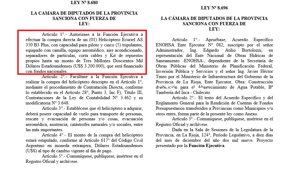 Artículo 1°.- Autorízase a la Función Ejecutiva a efectuar la compra directa de un (01) Helicóptero Ecuriel AS 350 B3 Plus, con capacidad para piloto y cinco (5) tripulantes, equipado con camilla, equipo aeromédico, aire acondicionado, separadores de partículas, corta cables y Kit de repuestos propios hasta un monto de Tres Millones Doscientos Mil Dólares Estadounidenses (U$S 3.200.000), que será financiado con fondos nacionales.