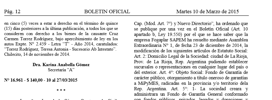 La Dra. Paola María Petrillo de Torcivía, Juez de la Cámara Primera en lo Civil, Comercial y de Minas, Secretaría “B”, a cargo del Registro Público de Comercio, Secretaría a cargo del Sr. Félix Fernando Leyes, Prosecretario, en los autos Expte. N° 12.470 -Letra “F” -Año 2015, caratulados: “Fogaplar S.A.P.E.M. s/Inscripción de Mod. de los Art. 2, 4, 5, 15, 16, 23 y 31, Aumento de Cap. (Mod. Art. 7°) y Nuevo Directorio”, ha ordenado que se publique por una vez en el Boletín Oficial (Art. 10 apartado b, Ley 19.550) por el que se hace saber que la empresa Fogaplar SAPEM ha resuelto mediante Asamblea Extraordinaria N° 1, de fecha 23 de diciembre de 2014, la modificación de los siguientes artículos de Estatuto Social: