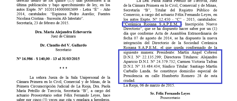 “Cerámica Riojana S.A.P.E.M. -Inscripción Nuevo Directorio”, que se ha dispuesto hacer saber por un (1) día que conforme Acta de Asamblea Extraordinaria de fecha 07 de agosto de 2014, se ha dispuesto la nueva integración del Directorio de la Sociedad Cerámica Riojana S.A.P.E.M., el que queda conformado de la siguiente manera: