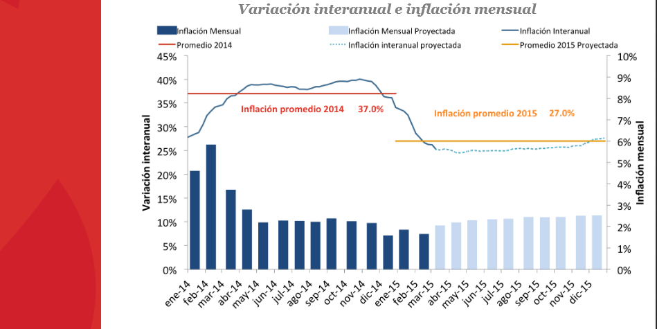 La variación semanal ubica la inflación cuatro semanas en 1.66%, equivalente a 1.84% mensual. Luego de que en la semana del 2 de febrero la inflación cuatro semanas registrara un aumento de 1.15%, su menor ritmo en lo que va del 2015 y equivalente a un aumento de 1.23% mensual, el registro se fue incrementando hasta alcanzar un 1.80% (1.99% mensual) la semana del 2 de marzo. La baja del último registro semanal hizo que la inflación de las últimas cuatro semanas descienda hasta 1.66% (1.84% mensual).