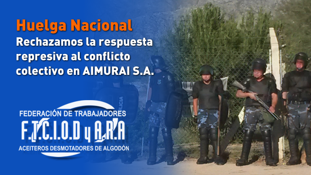 En la mañana de hoy, el gobierno de la provincia de La Rioja ha enviado a personal policial, con efectivos de la guardia de infantería, a intimar a los trabajadores que se encuentran ejerciendo su legítimo derecho de huelga ante la planta de la empresa, reclamando por la inmediata reincorporación de Alfredo Irazoque, Secretario General del Sindicato de Empleados y Obreros Aceiteros de la Provincia de la Rioja. La empresa AIMURAI S.A. despidió de forma discriminatoria y antisindical a Irazoque al día siguiente de la conformación del Sindicato de Aceiteros de la Rioja, fundado el 27 de marzo de 2015. Nuestra Federación se ha presentado ante las autoridades administrativas competentes, las cuales no se han hecho cargo de su responsabilidad, pretendiendo desconocer el carácter colectivo del conflicto.