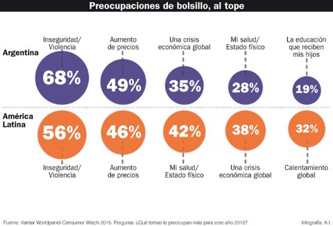 La suba de precios es el segundo factor que más preocupa a los argentinos según la encuesta de Kantar. La primera variable es la inseguridad y la violencia, que inquieta al 68% de los consultados este año, mientras que el año pasado la cifra era 10 puntos mayor. En el caso de la inflación, es una alarma para el 49% de los encuestados, mientras que el año pasado lo era para el 54%. La preocupación por los precios en 2015 está tres puntos por arriba del promedio de América Latina.