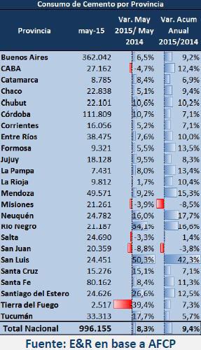 Cemento por provincia- En mayo de 2015 el consumo de cemento nacional en el interior del país alcanzó las 996.155 toneladas, con una suba interanual del 8,3%.