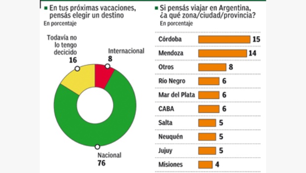 Entre los destinos más elegidos, se destacan Córdoba (con el 15%) y Mendoza (14%), mientras que con el 6% de las menciones figuran luego Río Negro, Mar del Plata y la Ciudad de Buenos Aires. Según datos de la agencia Almundo.com, entre los destinos locales preferidos figuran Buenos Aires, Iguazú, El Calafate, Salta, Ushuaia, Bariloche y Mendoza.