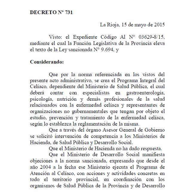 Que en igual sentido se pronuncia el Ministerio de Salud Pública, considerando no viable la promulgación del texto legal sancionado, atento la existencia de la Ley N° 9.207 “Ley de Celiaquía”.