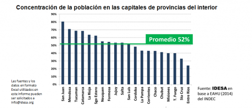 Estos datos muestran que la concentración de población urbana a nivel nacional se reproduce con mayor intensidad al interior de cada provincia. Incluso en la provincia con menos concentración, Entre Ríos, la capital Paraná absorbe un 24% de la población urbana. Se trata de una proporción todavía alta si se tiene en cuenta que, por ejemplo, París aglutina el 18% de la población de Francia o que en Berlín vive el 5% de la población de Alemania. Que la mitad de la población del interior del país habite en las capitales de cada provincia es un tema de alta relevancia para el diseño de políticas públicas.