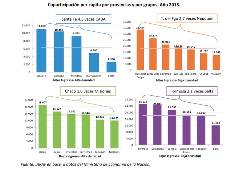 Durante 2015 la provincia de Tierra del Fuego fue la que más recursos por habitante obtuvo, con un promedio de 33.494 pesos. En el otro extremo se ubica la Ciudad de Buenos Aires donde sus habitantes recibieron ingresos el equivalentes al 8% de la provincia fueguina (2.580 pesos per cápita), mientras que en otros casos las diferencias también fueron importantes, como por ejemplo Buenos Aires (15%), Mendoza (28%) y Córdoba (31%).