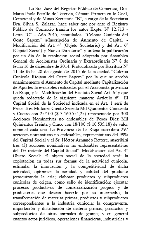 La Sra. Juez del Registro Público de Comercio, Dra. María Paola Petrillo de Torcivía, Cámara Primera en lo Civil, Comercial y de Minas Secretaría “B”, a cargo de la Secretaria Dra. Silvia S. Zalazar, hace saber que por ante el Registro Público de Comercio tramita los autos Expte. Nº 12.713 -Letra “C” -Año 2015, caratulados: “Colonia Cunícola del Oeste Sapem” s/Inscripción de Aumento de Capital -Modificación del Art. 4º (Objeto Societario) y del Art. 6º (Capital Social) y Nuevo Directorio” y ordena la publicación por un día de la resolución social adoptada por Asamblea General de Accionistas Ordinaria y Extraordinaria Nº 8 de fecha 16 de diciembre de 2014. Protocolizado por Escritura Nº 11 de fecha 28 de agosto de 2015 de la sociedad “Colonia Cunícola Riojana del Oeste Sapem” por la que se aprobó unánimemente el Aumento de Capital mediante Capitalización de Aportes Irrevocables realizados por el Accionista provincia La Rioja, y la Modificación del Estatuto Social Art. 6º y que queda redactado de la siguiente manera: