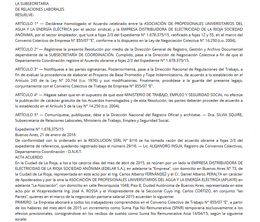 Que a fojas 2/3 del Expediente N° 1.678.375/15, luce agregado el Acuerdo celebrado entre la ASOCIACIÓN DE PROFESIONALES UNIVERSITARIOS DEL AGUA Y LA ENERGÍA ELÉCTRICA por el sector sindical, y la EMPRESA DISTRIBUIDORA DE ELECTRICIDAD DE LA RIOJA SOCIEDAD ANÓNIMA, por el sector empleador, ratificado a fojas 12 y 55, en el marco del Convenio Colectivo de Empresa N° 855/07 “E”, conforme lo dispuesto en la Ley de Negociación Colectiva N° 14.250 (t.o. 2004).