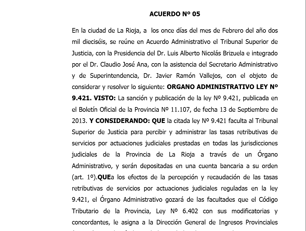 QUE la citada ley Nº 9.421 faculta al Tribunal Superior de Justicia para percibir y administrar las tasas retributivas de servicios por actuaciones judiciales prestadas en todas las jurisdicciones judiciales de la Provincia de La Rioja a través de un Órgano Administrativo, y serán depositadas en una cuenta bancaria a su orden (art. 1º).