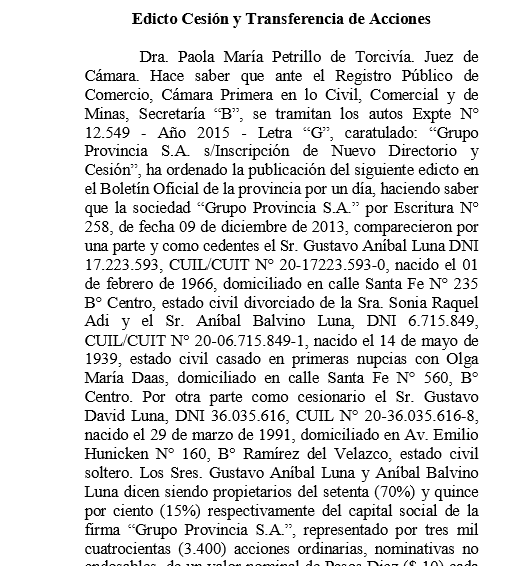 Dra. Paola María Petrillo de Torcivía. Juez de Cámara. Hace saber que ante el Registro Público de Comercio, Cámara Primera en lo Civil, Comercial y de Minas, Secretaría “B”, se tramitan los autos Expte N° 12.549 -Año 2015 -Letra “G”, caratulado: “Grupo Provincia S.A. s/Inscripción de Nuevo Directorio y Cesión”, ha ordenado la publicación del siguiente edicto en el Boletín Oficial de la provincia por un día, haciendo saber que la sociedad “Grupo Provincia S.A.” por Escritura N° 258, de fecha 09 de diciembre de 2013, comparecieron por una parte y como cedentes el Sr. Gustavo Aníbal Luna DNI 17.223.593, CUIL/CUIT N° 20-17223.593-0, nacido el 01 de febrero de 1966, domiciliado en calle Santa Fe N° 235 B° Centro, estado civil divorciado de la Sra. Sonia Raquel Adi y el Sr. Aníbal Balvino Luna, DNI 6.715.849, CUIL/CUIT N° 20-06.715.849-1, nacido el 14 de mayo de 1939, estado civil casado en primeras nupcias con Olga María Daas, domiciliado en calle Santa Fe N° 560, B° Centro. Por otra parte como cesionario el Sr. Gustavo David Luna, DNI 36.035.616, CUIL N° 20-36.035.616-8, nacido el 29 de marzo de 1991, domiciliado en Av. Emilio Hunicken N° 160, B° Ramírez del Velazco, estado civil soltero.