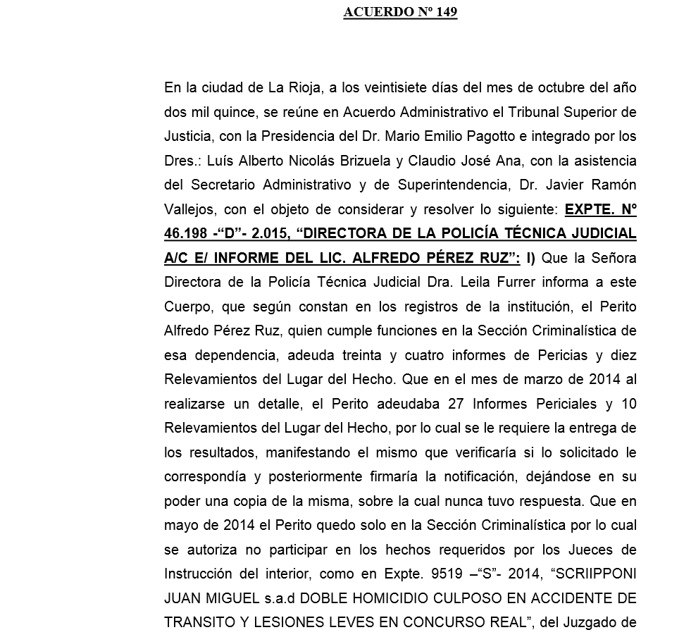 En la ciudad de La Rioja, a los veintisiete días del mes de octubre del año dos mil quince, se reúne en Acuerdo Administrativo el Tribunal Superior de Justicia, con la Presidencia del Dr. Mario Emilio Pagotto e integrado por los Dres.: Luís Alberto Nicolás Brizuela y Claudio José Ana, con la asistencia del Secretario Administrativo y de Superintendencia, Dr. Javier Ramón Vallejos, con el objeto de considerar y resolver lo siguiente: EXPTE. Nº 46.198 -“D”- 2.015, “DIRECTORA DE LA POLICÍA TÉCNICA JUDICIAL A/C E/ INFORME DEL LIC. ALFREDO PÉREZ RUZ”: