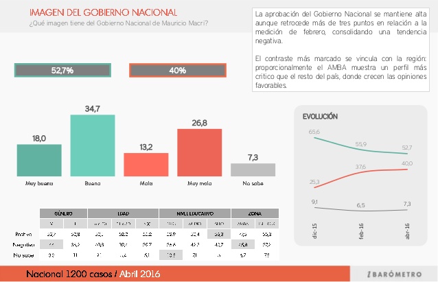 En cuanto a la imagen del gobierno nacional, sigue siendo alta ya que llega al 52,7 % buena y muy buena contra el 40 % de mala o muy mala. Aunque debe decirse que ese 52 % era en diciembre el 66 %.
