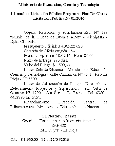 Lugar de Adquisición de Pliegos: Dirección de Relevamiento, Proyectos y Supervisión – Av. Ortiz de Ocampo N° 1700 – Ala Sur -La Rioja -Tel. 0380 – 4453790 Int. 5151.