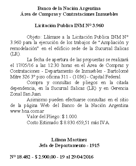 Objeto: Llámase a la Licitación Pública INM N° 3.960 para la ejecución de los trabajos de “Ampliación y remodelación” en el edificio sede de la Sucursal Salicas (LR).