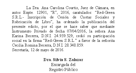 La Dra. Ana Carolina Courtis, Juez de Cámara, en autos Expte. 12901, “R”, 2016, caratulados: “Red-Green S.R.L.- Inscripción de Cesión de Cuotas Sociales y Rubricación de Libro”, ha ordenado la publicación del presente edicto, por el que se hace saber que mediante Instrumento Privado de fecha 07/04/2016, la señora Ana Karina Becerra, D.N.I. 24.939.529, cedió su participación social en la firma “Red-Green S.R.L.” a favor de la señorita Cecilia Romina Becerra, D.N.I. 28.348.859.