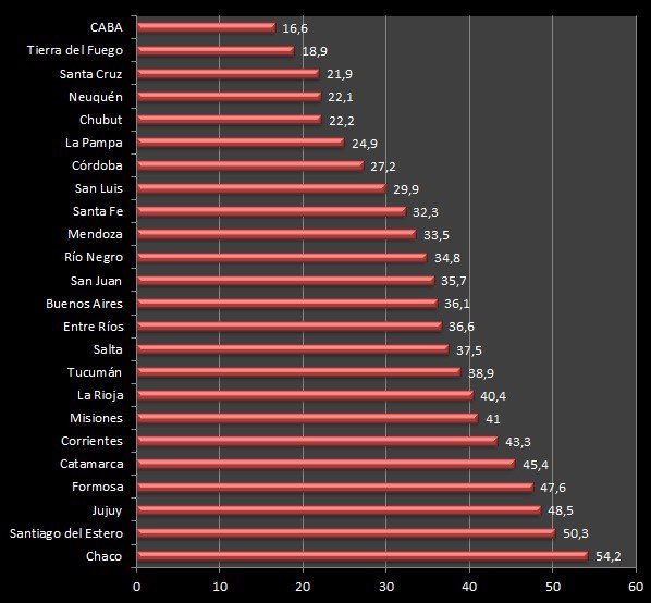 En una situación similar se encuentran Santiago del Estero (50,3%) y Jujuy (48,5%). Por el contrario, en la Ciudad de Buenos Aires (16,6%), Tierra del Fuego (18,9%) y Santa Cruz (21,9%), los datos son más auspiciosos.
