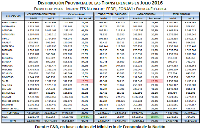 Según el informe, hubo un aumento del 24% por fondos coparticipables en el mes de julio.