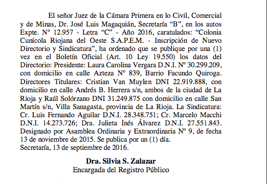El señor Juez de la Cámara Primera en lo Civil, Comercial y de Minas, Dr. José Luis Magaquián, Secretaría “B”, en los autos Expte. No 12.957 – Letra “C” – Año 2016, caratulados: “Colonia Cunícola Riojana del Oeste S.A.P.E.M. – Inscripción de Nuevo Directorio y Sindicatura”, ha ordenado que se publique por una (1) vez en el Boletín Oficial (Art. 10 Ley 19.550) los datos del Directorio: