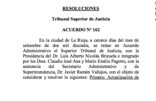 En la ciudad de La Rioja, a catorce días del mes de setiembre de dos mil dieciséis, se reúne en Acuerdo Administrativo el Superior Tribunal de Justicia, con la Presidencia del Dr. Luis Alberto Nicolás Brizuela e integrado por los Dres. Claudio José Ana y Mario Emilio Pagotto, con la asistencia del Secretario Administrativo y de Superintendencia, Dr. Javier Ramón Vallejos, con el objeto de considerar y resolver lo siguiente: