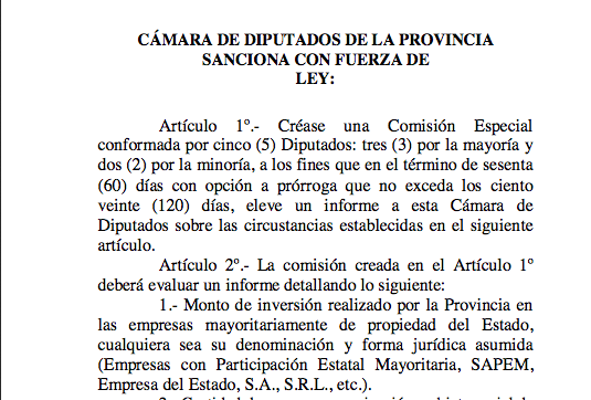 Artículo 1o.- Créase una Comisión Especial conformada por cinco (5) Diputados: tres (3) por la mayoría y dos (2) por la minoría, a los fines que en el término de sesenta (60) días con opción a prórroga que no exceda los ciento veinte (120) días, eleve un informe a esta Cámara de Diputados sobre las circustancias establecidas en el siguiente artículo.