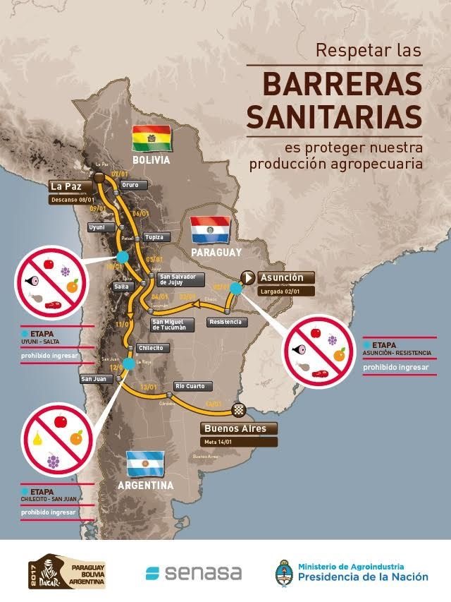Con el propósito de prevenir el ingreso de plagas y enfermedades que pongan en riesgo la producción agropecuaria y el estado zoofitosanitario del país, el Senasa realizará controles, asesoramiento y actividades de comunicación con los participantes del Rally Dakar Paraguay-Bolivia-Argentina 2017.