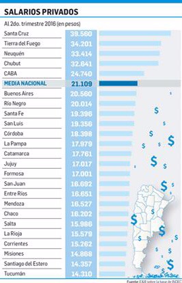 El dato surge de una investigación de la consultora Economía&Regiones sobre datos publicados por el INDEC en referencia a remuneraciones brutas del sector privado en el segundo trimestre de 2016. Así, el salario promedio de Santa Cruz se encuentra en más de $18 mil por encima de la media nacional, que es de $21.109.