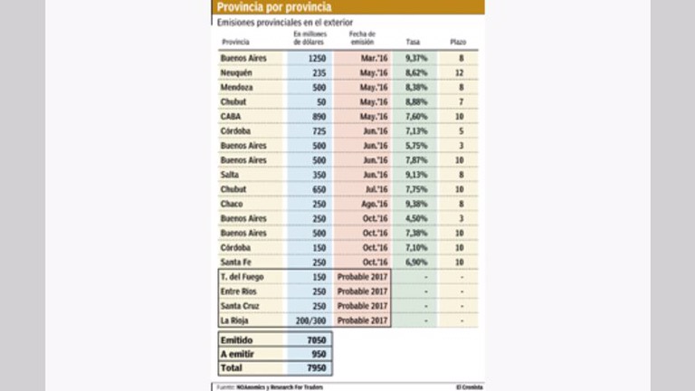 Mencionó que provincia de Buenos Aires estima emitir por la mitad que en 2016 (el año pasado colocó u$s 3000 millones) y Chubut, por ejemplo, que consiguió u$s 650 millones, ahora no planea salir a los mercados internacionales.