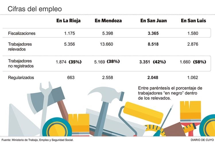 La provincia de San Juan es una de las que más empleo en negro tiene en la región. La tasa de informalidad trepó a 43% al concluir el 2016, superando en tres puntos porcentuales a la media del 40% de Cuyo. De todos modos, no es la peor, ya que ese puesto se reserva a San Luis que cerró el año con un 58% de trabajadores no registrados. La Rioja cerró con un 39% de informalidad y Mendoza con 38 %, según los datos de la delegación Regional San Juan, del Ministerio de Trabajo, Empleo y Seguridad Social.