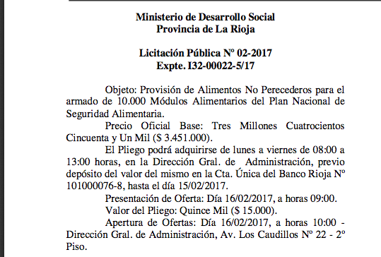 El Pliego podrá adquirirse de lunes a viernes de 08:00 a 13:00 horas, en la Dirección Gral. de Administración, previo depósito del valor del mismo en la Cta. Única del Banco Rioja No 101000076-8, hasta el día 15/02/2017.