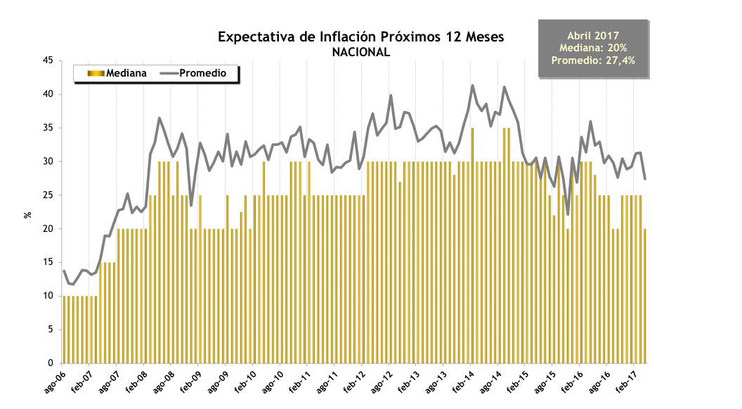 “Según el promedio, las expectativas de inflación caen 3,9 puntos porcentuales respecto de la medición de marzo de 2017 y se ubican en 27,4%.”