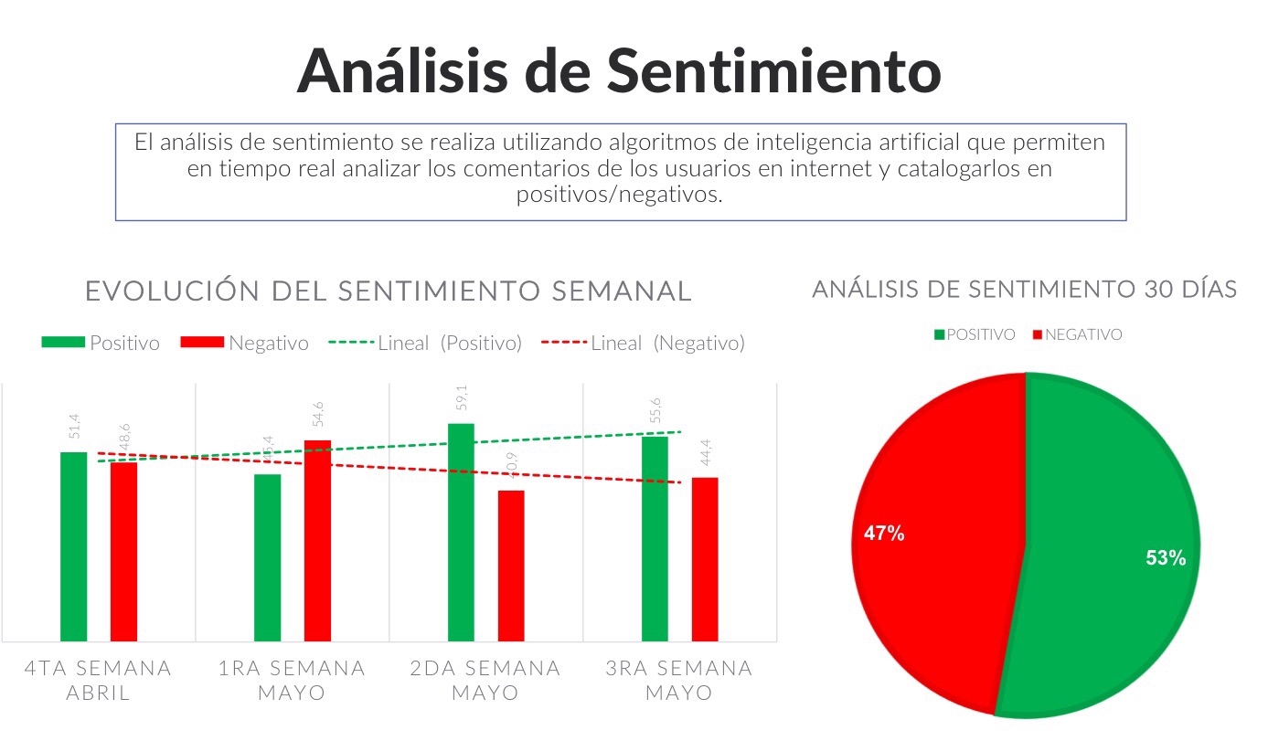 El sistema recoge menciones en todo internet, los guarda en una base de datos para luego procesarlos y analizarlos. El resultados final genera un informe de todos los comentarios realizados de en Internet ya sean favorables o desfavorables de la figura presidencial o lo que necesitemos medir.