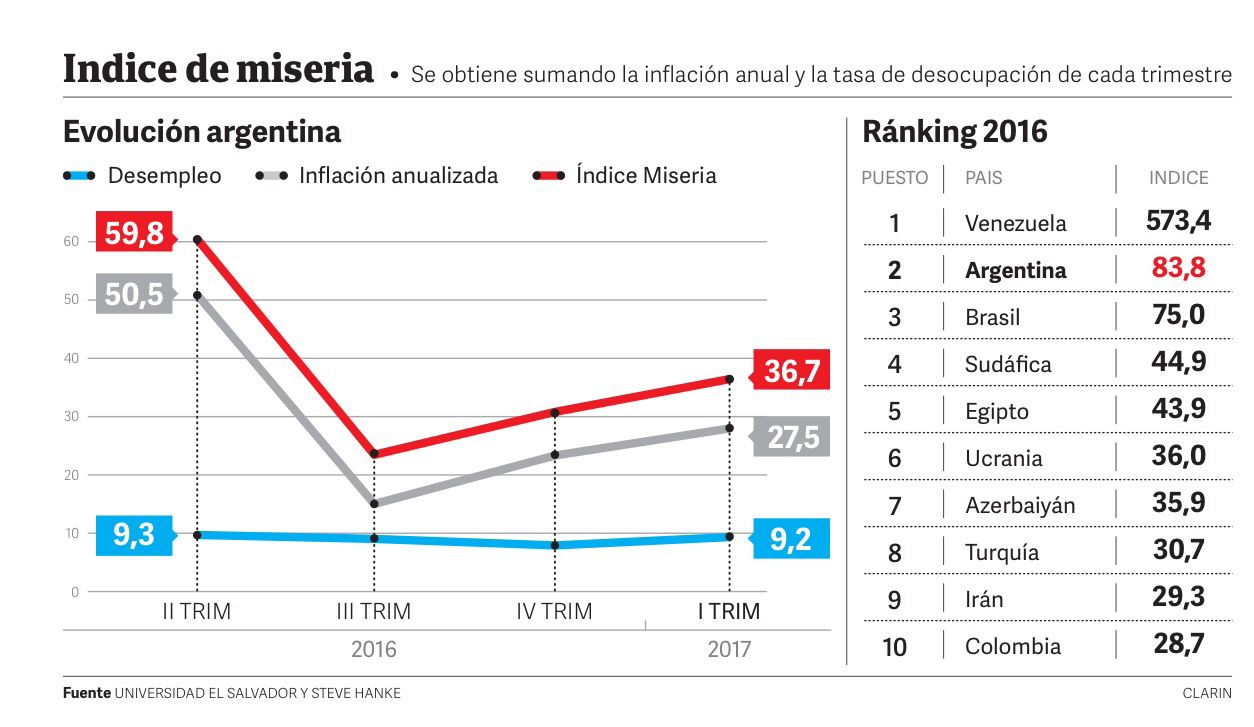 El índice es problemático porque con inflaciones altas o moderadas, como la actual argentina, pesan más las variaciones en el ritmo al que suben los precios que las del desempleo. Esto permite explicar por qué en 2016, con la salida del cepo y la devaluación, Argentina registró el segundo índice de miseria más alto del mundo según el economista de la Universidad John Hopkins de Washington, Steve Hanke. También invita a pronosticar por qué el índice sería la mitad para cuando se celebren las elecciones. En junio del año pasado la inflación porteña interanual fue 47,1% y si se tiene en cuenta la inflación esperada de octubre (REM), los precios ese mes podrían estar viajando a una trayectoria anual de 17%.