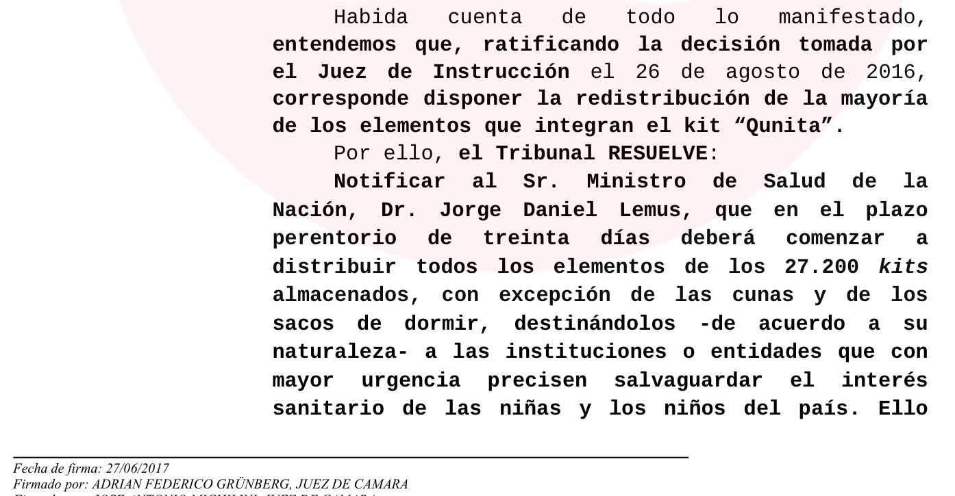 El Tribunal Oral en lo Criminal Federal N° 1 de la Capital, integrado por los jueces Adrián Grünberg, José Antonio Michilini y Gabriel Vega, hizo saber al ministro de Salud de la Nación, Jorge Daniel Lemus, que en el plazo perentorio de treinta días deberá comenzar a distribuir todos los elementos de los 27.200 kits almacenados, con excepción de las cunas y de los sacos de dormir, destinándolos -de acuerdo a su naturaleza- a las instituciones o entidades que con mayor urgencia precisen salvaguardar el interés sanitario de las niñas y los niños del país.