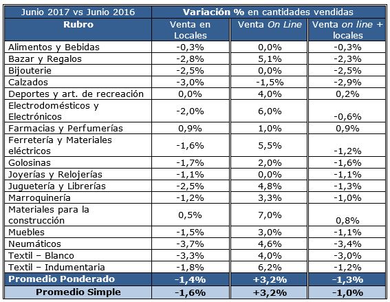 • En el rubro ‘Electrodomésticos y artículos electrónicos’, las cantidades vendidas disminuyeron 2,0%, mientras que en la modalidad on line, que explica el 18% de las operaciones del sector, subieron 6%. Esto arroja como resultado final una caída anual de 0,6% frente a junio del 2016 (siempre medidas en cantidades). Hubo reducciones de precios en muchos productos de computación que estimularon su salida y empujaron al sector hacia arriba, especialmente cuando hubo facilidades de pagos de hasta 12 o 18 cuotas sin interés. El Día del Padre ayudó a impulsar el consumo también.