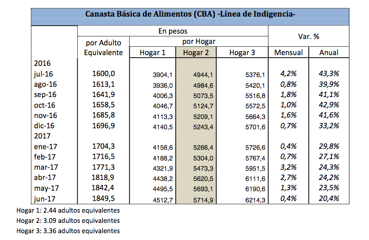 El estudio precisa que el costo de la Canasta Básica Total (CBT) subió 0,3% en junio, acumulando un incremento del 21% en los últimos doce meses, hasta alcanzar un valor de 13.361 pesos.