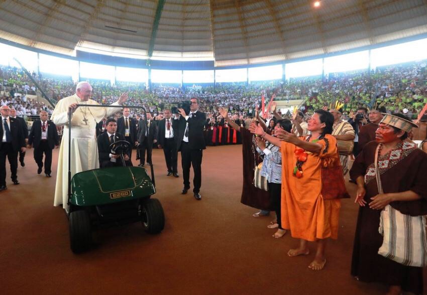 Los pueblos y naciones indígenas presentes expresaban su preocupación por la destrucción del ambiente, de la vida de las jóvenes generaciones y de la cultura. Con danzas y sentidas intervenciones, le pidieron al Papa que los defendiera de todas esas plagas que amenazan con destruirlos para siempre. Conmovido, Francisco acogió esa súplica con palabras de contención, aliento y esperanza. Y renovó su compromiso evangelizador explicitando la celebración del Sínodo de Obispos para el Amazonas ya convocado para 2019 y cuya primera reunión preparatoria tendría lugar ese mismo día, allí, en Puerto Maldonado esa tarde. Será un acontecimiento de alta importancia pastoral no sólo para el Amazonas sino para toda América Latina, en vistas a concretar la importante reflexión del magisterio de Laudato si y la promoción integral de los pueblos originarios, con su rica cultura y su llamada a un buen vivir en relación con la tierra, con los hombres, y con el Creador.