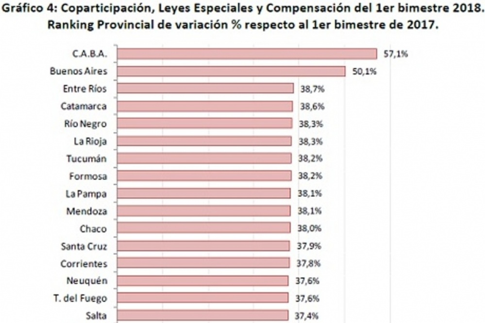 De acuerdo con los datos que surgen de un Informe del Instituto Argentino de Análisis Fiscal (IARAF) el mayor impacto por recursos coparticipables se dio en CABA 57,1%, Buenos Aires 50,1%, Entre Ríos 38,7%, Catamarca 38,6% y en quinto lugar se ubican Río Negro y La Rioja con 38,3%, según el diario El Ancasti.