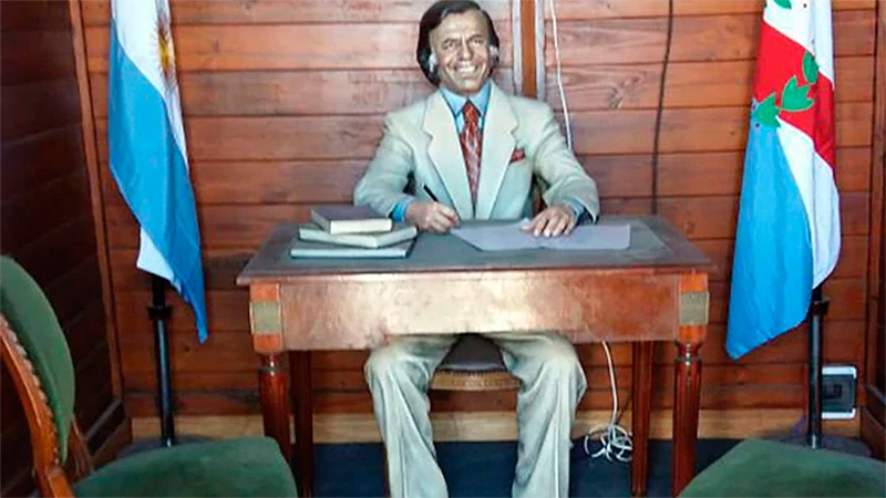 La estatua del dirigente peronista, en la cual se lo ve sonriente y con sus clásicas patillas, forma parte del denominado «Paseo Cultural Presidente Menem», que también incluirá una galería vidriada y un «museo vivo» con pertenencias del dirigente.