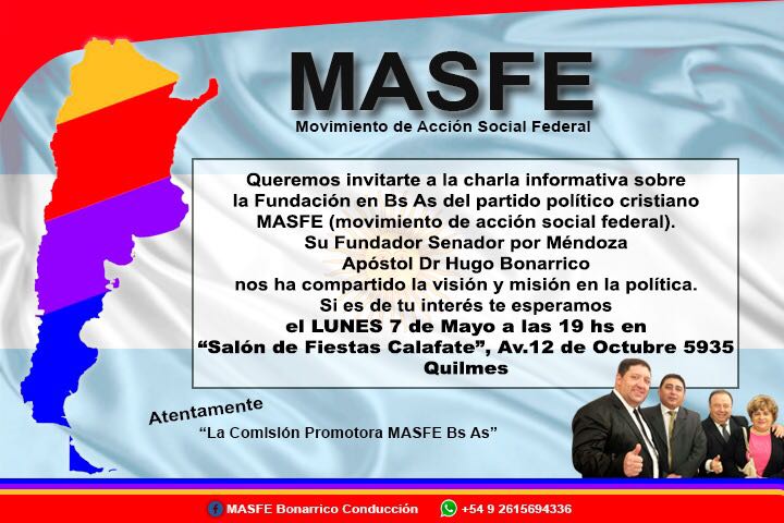 A las 19, en el Salón de fiestas Calafate de la ciudad del sur del conurbano, tendrá lugar lo que se presenta como la “charla informativa” sobre la fundación en la provincia del Movimiento de Acción Social Federal (MASFE) liderado por Héctor Hugo Bonarrico, un pastor que con su prédica en contra de Satanás y las tinieblas fue electo el año pasado senador provincial de Mendoza, en una alianza con el Partido Intransigente.