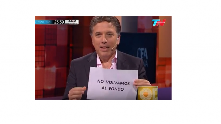 En su rol de columnista económico del programa, Dujovne se presentó en la ocasión portando un cartel con la frase “No volvamos al Fondo”, que por entonces era una consigna de sectores de la oposición, en particular de diputados del kirchnerismo.