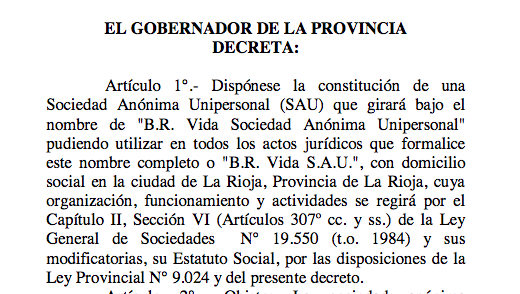 El gobernador Sergio Casas dispuso la constitución de una Sociedad Anónima Unipersonal (SAU) que girará bajo el nombre de «B.R. Vida Sociedad Anónima Unipersonal» pudiendo utilizar en todos los actos jurídicos que formalice este nombre completo o «B.R. Vida S.A.U.»