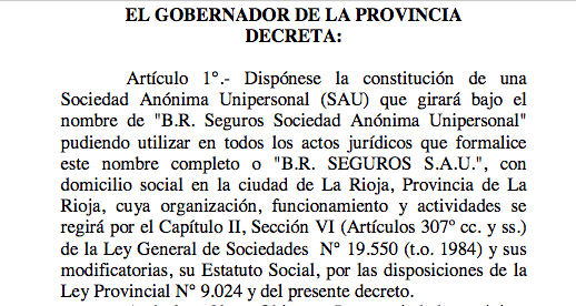 Artículo 1°.- Dispónese la constitución de una Sociedad Anónima Unipersonal (SAU) que girará bajo el nombre de «B.R. Seguros Sociedad Anónima Unipersonal» pudiendo utilizar en todos los actos jurídicos que formalice este nombre completo o «B.R. SEGUROS S.A.U.», con domicilio social en la ciudad de La Rioja, Provincia de La Rioja, cuya organización, funcionamiento y actividades se regirá por el Capítulo II, Sección VI (Artículos 307º cc. y ss.) de la Ley General de Sociedades N° 19.550 (t.o. 1984) y sus modificatorias, su Estatuto Social, por las disposicion es de la Ley Provincial N° 9.024 y del presente decreto.