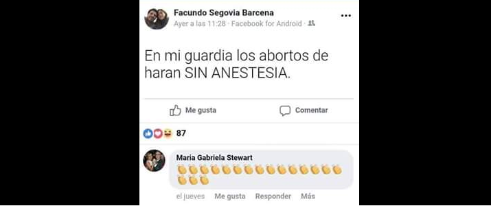A través de su cuenta en Facebook, Segovia Barcena afirmó: «En mi guardia los abortos se harán sin anestesia».