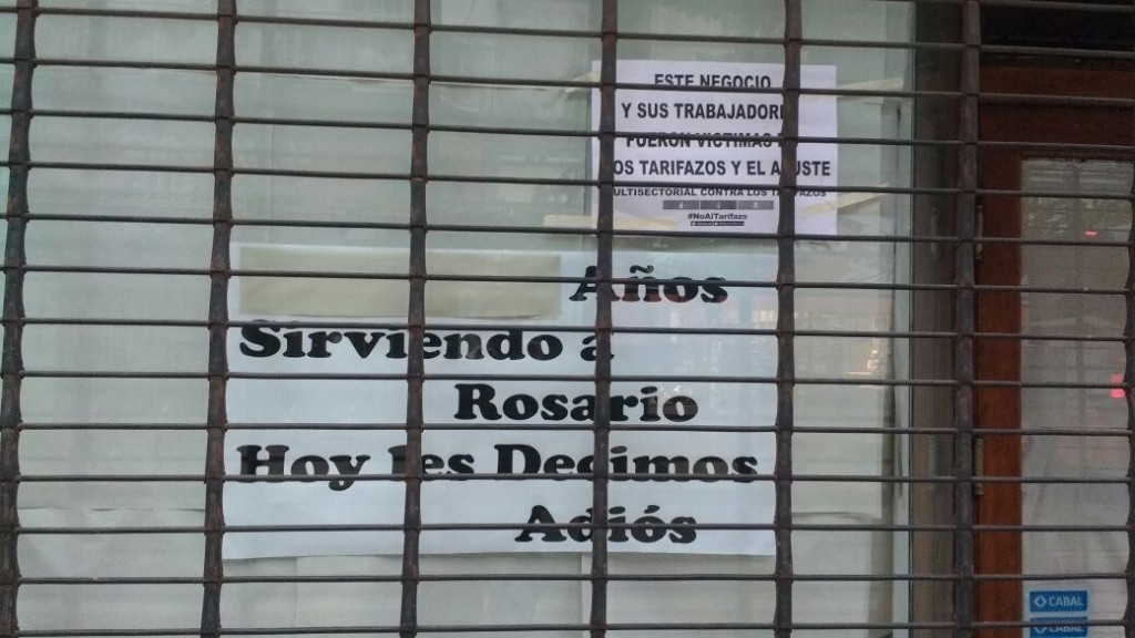 La Multisectorial Contra los Tarifazos Rosario realizó esta semana una campaña de relevamiento de locales cerrados y contó 350 sólo en el centro de esa ciudad. Para llamar la atención de peatones y ciudadanos desprevenidos, los señalizaron con la leyenda “este negocio y sus trabajadores fueron víctimas de los tarifazos y el ajuste”.