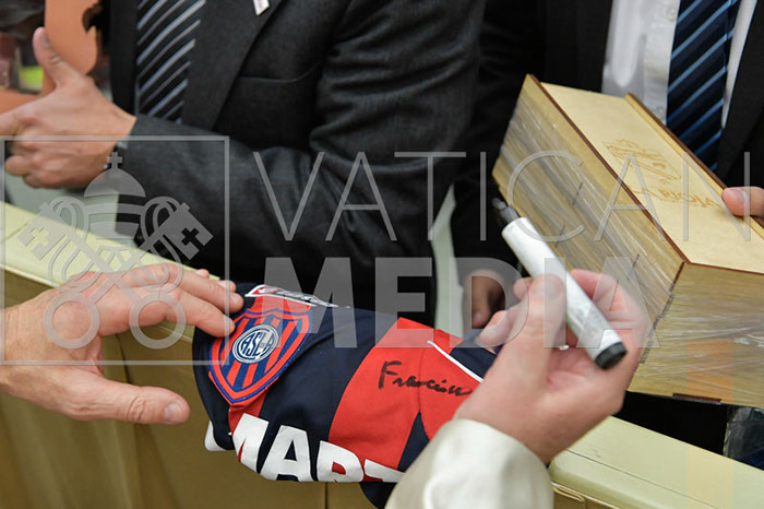 La sesión fotográfica se caracteriza por la firma del Papa a una camiseta de San Lorenzo, cuyo hincha es el jefe comunal de La Rioja. Y además está acompañado por su esposa.