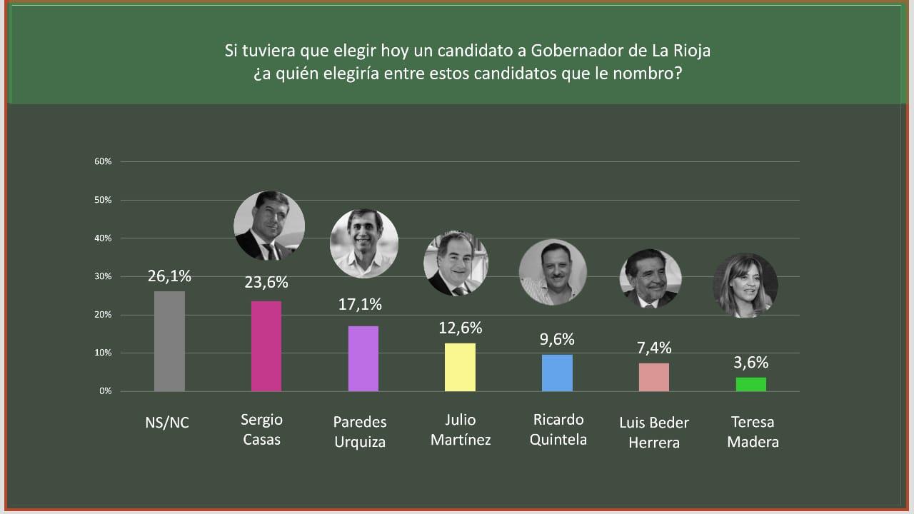 No sabe/No contesta, 26,1%; Sergio Casas, 23,6%; Alberto Paredes Urquiza, 17,1%; Julio Martínez, 12,6%; Ricardo Quintela, 9,6%; Luis Beder Herrera, 7,4%; y Teresita Madera, 3,6%.