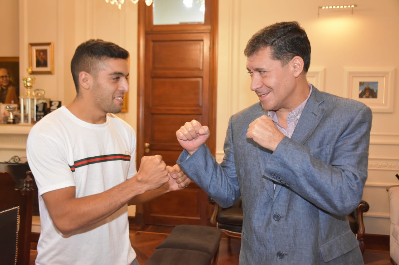 En la ocasión, el joven deportista comentó al gobernador la posibilidad de competir por el Título Latino en La Rioja y expuso sus deseos de ganarlo en la Provincia.