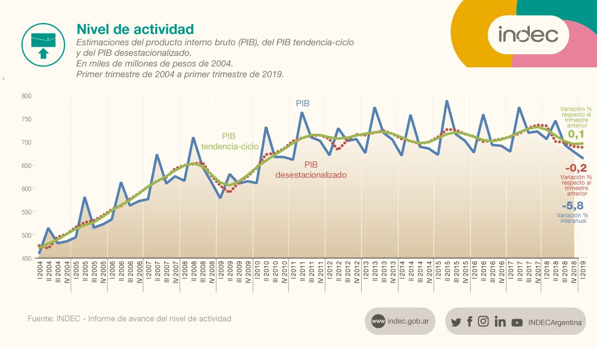 El Producto Bruto Interno (PBI) bajó 5,8% al término del primer trimestre del año en relación a igual período de 2018, debido a la menor producción fabril, de la inversión y el retroceso del comercio, informó hoy el Instituto Nacional de Estadística y Censos (Indec).